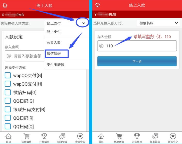 登入账号后,点击我要充值, 再点击微信转账,并填写存入金额。注:此处存入金额只支持整数,不支持小数点。