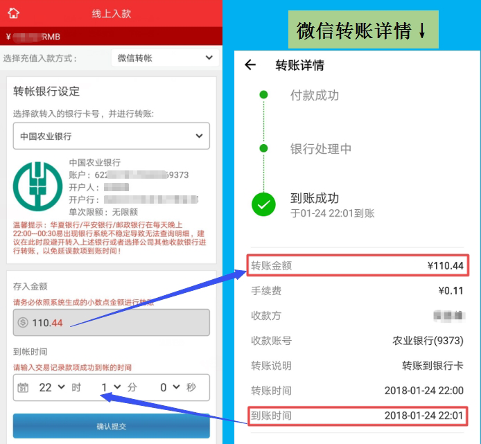 进入微信转账页面后,记录/复制好公司收款银行账户,登陆您的微信进行转账,且微信实际转账金额必须与页面显示的金额一致。转账成功后,等待转账详情--显示到账成功。按照提示填写您的到账时间,在点击确认提交。(温馨提示:使用微信转账至农业银行是即时到账的;务必先转账成功在提交,否则财务人员查询不到款项无法第一时间帮您添加额度。)